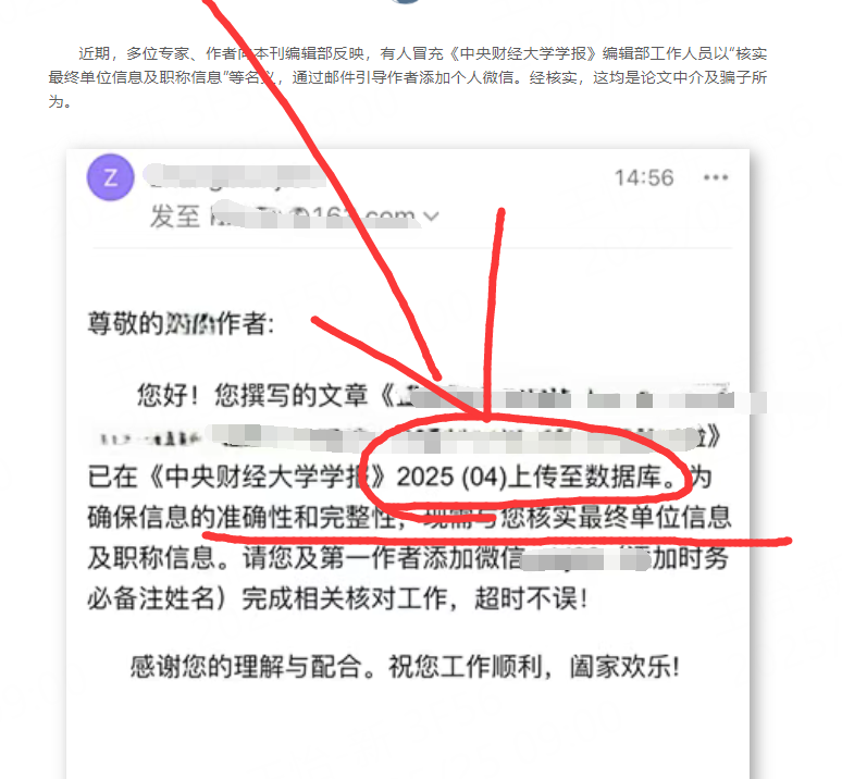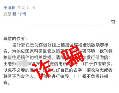 近日,《中央財(cái)經(jīng)大學(xué)學(xué)報(bào)》發(fā)布《鄭重聲明|警惕騙子冒充〈 中央財(cái)經(jīng)大學(xué)學(xué)報(bào)〉編輯部工作人員行騙》的消息,其實(shí)這個(gè)“釣魚郵件”一眼假,在數(shù)據(jù)庫已經(jīng)收錄作者論文的時(shí)候,為什么還會(huì)再核實(shí)單位信息呢?如果單位和作者信息真的存疑,那么文章又為何會(huì)上知網(wǎng)?你以為謹(jǐn)小慎微的雜志編輯部都太閑了,需要給自己找點(diǎn)事情做?
